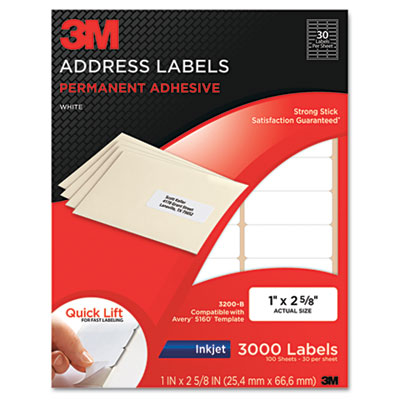 MMM3200B Permanent Adhesive White Mailing Labels f/ Inkjet Printers, 1 x 2-5/8, 3000/Pack By 3M/COMMERCIAL TAPE DIV.