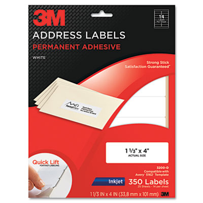 MMM3200D Permanent Adhesive White Inkjet Mailing Labels, 1-1/3 x 4, 350/Pack By 3M/COMMERCIAL TAPE DIV.