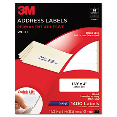 MMM3200E Permanent Adhesive White Mailing Labels f/ Inkjet Printers, 1-1/3 x 4, 1400/Pack By 3M/COMMERCIAL TAPE DIV.