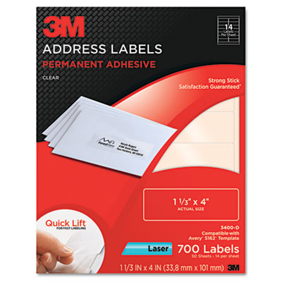 MMM3400D Permanent Adhesive Clear Laser Mailing Labels, 1-1/3 x 4, 700/Pack By 3M/COMMERCIAL TAPE DIV.