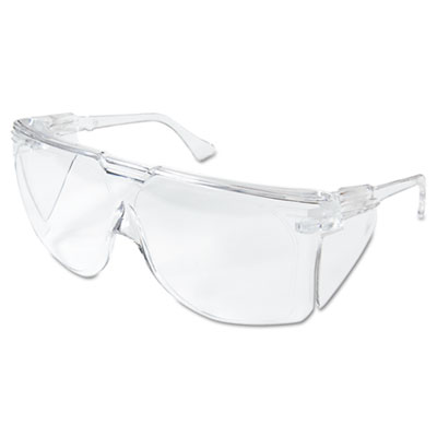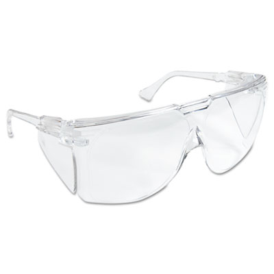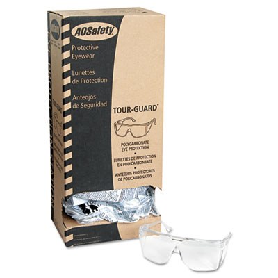 Economical protection ideal for visitors and whole crews. Fits over most personal prescription eyewear. Polycarbonate lenses absorb 99.9% UV. Wall-mountable dispenser box for easy access. Style: Wraparound; Frame Color: Clear.