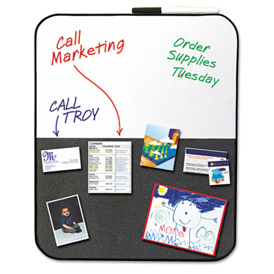 - Combination board offers two surfaces: a long-lasting adhesive surface on one half where you can display, reposition and remove documents without pins, tacks or tape and a dry erase board on the other half.