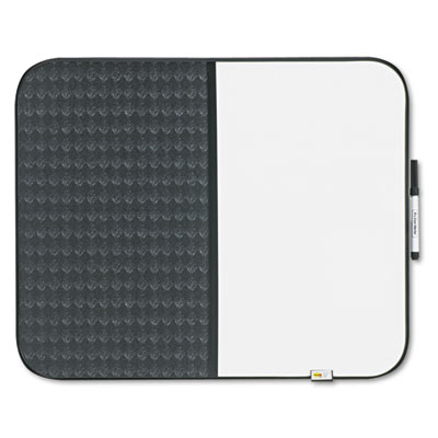 Make the most of small spaces like cubicles and home offices. Combination board offers two surfaces: a long-lasting adhesive surface on one half where you can display documents without pins, tacks or tape and a dry erase board on the other half. Plastic frame. Includes black dry-erase marker and mounting hardware. Charcoal gray and white surfaces. Board Type: Bulletin Board; Board Width: 22"; Board Height: 18".