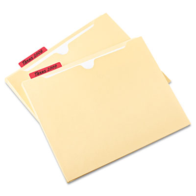 Here's a simple way to get files organized, labeled and color-coded in one easy package. Secure, striped, self-stick tabs offer quick and easy tabbing and indexing. Easy to write on and simple to remove, replace or reposition. Use them to label file folders, exanding files and project files. Great for flagging pages in notebooks, books and catalogs. Packaged in a pop-up dispenser. File Insert/Tab Type: Adhesive File Folder Tabs; Color(s): Red.