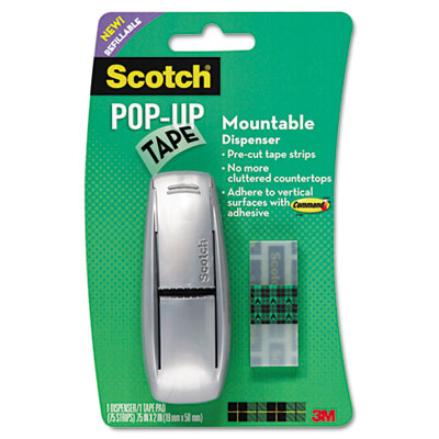 Convenience right at your fingertips. Pre-cut 2" tape strips pop-up one-at-a-time from the handy dispenser. Helps you stick to the tasks at hand, just about anywhere. Tape Special Feature: Refillable Mountable Dispenser.