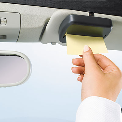 Just clip it to the visor of your vehicle and you are ready to go. Comes with a 100 sheet pad of Pop-up notes in Canary Yellow. Note Dispenser Type: Post-it Pop-up; Accepts Pad Size (W x H): 3" x 3"; Color(s): Black.
