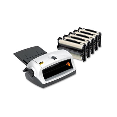 Perfect lamination without electricity. Safe, heat-free and easy to use, with no warm-up waiting time, no fumes and no mess. Laminates in three easy steps. Fully compatible with inkjet, thermal and other sensitive papers. For documents up to 8 1/2" wide, 1/10" thick and 90-ft.long. Features easy-loading cartridge, adjustable input tray. Includes five DL961, 90-ft. dual laminating film cartridges and 9" laminator. Maximum Document Size: 8 1/2" Wide; Maximum Document Thickness: 9.2 mils.