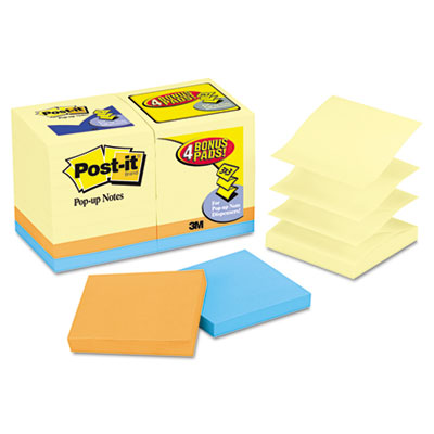 Pop-up refill note pads are convenient and perfect for everyday messages and reminders. Dispenser sold separately. Includes 14 pads Canary Yellow and four FREE pads in Bright Colors. Pad Type: Pop-Up; Sheet Size (W x H): 3 in x 3 in; Number of Sheets per Pad: 100; Assortment: N/A.