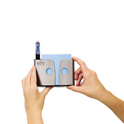 Dispenser mounts vertically on wall or door with Command™ adhesive and holds accordion-style pop-up notes with added space for your pens. Includes one 90-sheet pad of 4 x 4 lined Canary Yellow notes. Note Dispenser Type: Vertically-Mounted Self-Stick Note Holder; Accepts Pad Size (W x H): 4" x 4"; Color(s): Chrome.