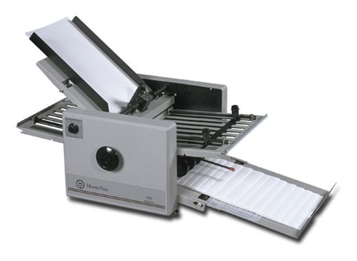 The premium friction-fed machine in our product line, the Martin Yale 959 boasts a maximum sheet size of 14" x 20". Additional features include scoring, slitting and perforating. The adjustable speed control allows a variety of material weights to be folded and angular control adjustment of the entrance rollers insures a square fold consistently.