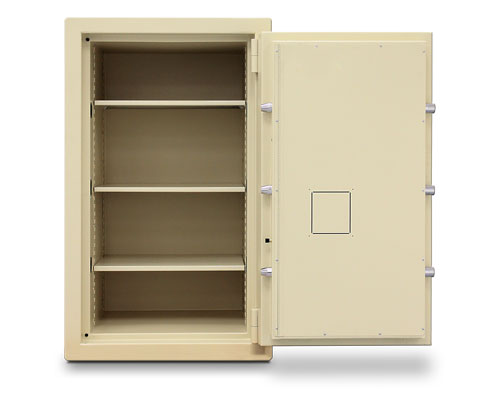 The door is constructed with a 2-3/4" defense barrier of outer and inner steel plates creating a single structure enclosing a unique, high-density fire and burglary resistant composite material. The defense barrier houses a propriety amalgamation of nuggets and steel fibers to withstand concentrated attacks with the most sophisticated equipment used by burglars today A massive 1-1/2" diameter chrome plated solid steel locking bolts, each bolt moves deep into the body's protected bolt chambers. The safe is equipped with heavy-duty solid steel hinges.