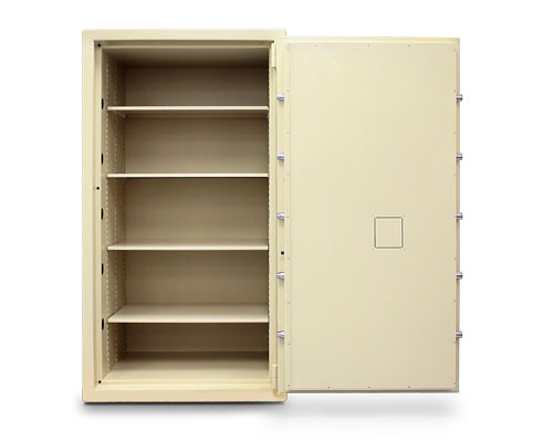 The door is constructed with a 2-3/4" defense barrier of outer and inner steel plates creating a single structure enclosing a unique, high-density fire and burglary resistant composite material. The defense barrier houses a propriety amalgamation of nuggets and steel fibers to withstand concentrated attacks with the most sophisticated equipment used by burglars today A massive 1-1/2" diameter chrome plated solid steel locking bolts, each bolt moves deep into the body's protected bolt chambers. The safe is equipped with heavy-duty solid steel hinges.