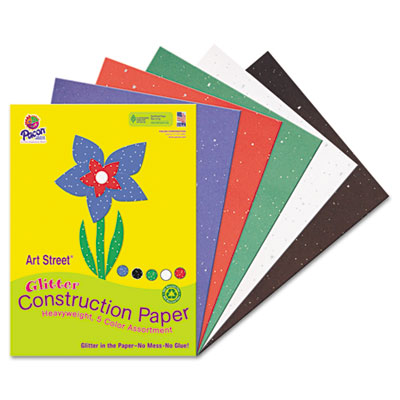 Unique heavyweight construction paper has the glitter right in the paper. No mess—no glue needed. Acid-free. Size: 9 x 12; Paper Color(s): Assorted; Paper Weight: 76 lb..