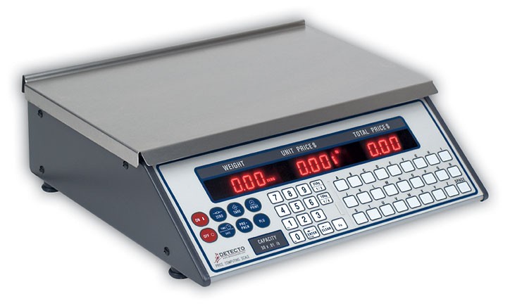 Detecto's "legal for trade" Price Computing Scales feature a brilliant red display that shows weight, unit price and total price simultaneously on each side of the scale to both operator and customer. Other features include 99 programmable preset prices which are retained in memory when power to the scale is turned off, an RS-232 serial port for connection to a label printer, and customized printing features including "Packed on" or "Sell by" dates. The low profile, compact design is perfect for limited counter space in businesses like delis, meat shops, candy counters, cheese shops... where anything is sold by weight.