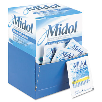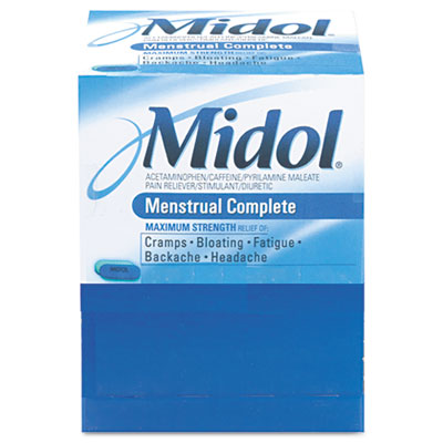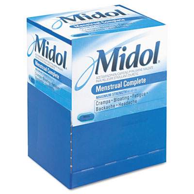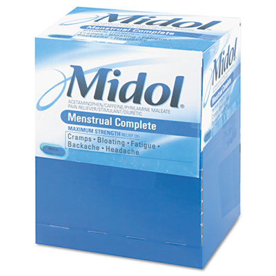 Provides relief of many symptoms suffered during your menstrual period. Unique combination of a maximum strength pain reliever, a diuretic to help relieve bloating and caffeine to help fight fatigue. Packaged for individual use to replenish first aid stations and kits. Contains: Acetaminophen;Caffeine;Pyrilamine Maleate; Description: 2/Pack; Quantity: 50 per box.