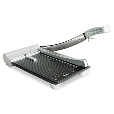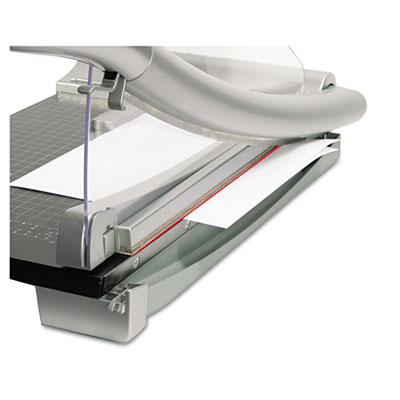 Heavy-duty guillotine trimmer is also compact for easy portability. Features automatic clamp mechanism that securely holds tall stacks for accurate cutting without shifting or tearing. Precise lighted cutting line plus high-precision, easy-to-read pad printed graphics help ensure greater cutting accuracy. Patented automatic blade latch locks with every cutting motion. Auto clamp also functions as safety precaution. Trimmer Board Type: Bypass; Sheet Capacity: 40; Cut Length: 15".