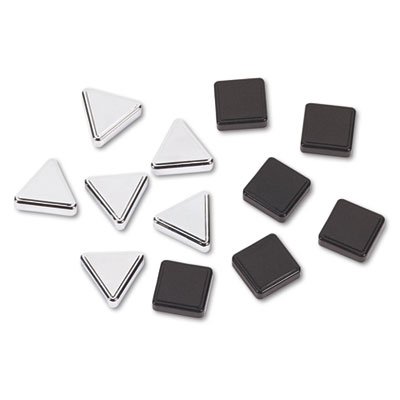 Contemporary magnets highlight posted information. Clear plastic storage container includes six each of silver triangles and metallic black squares. Character Types: Squares;Triangles; Mounting Type: Magnetic.