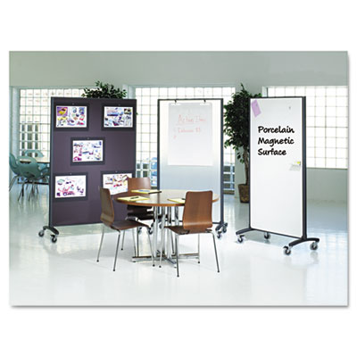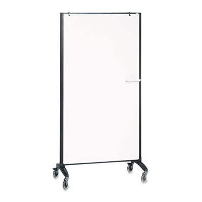 Multifunctional as a rolling room divider for privacy, a whiteboard for writing and a bulletin board for posting. Magnetic whiteboard with flipchart pad holder is ideal tool for presentations and meetings. Fabric bulletin surface on reverse side allows you to display items. Sleek narrow footprint and easy mobility with four modern design wheels. Dividers nest for compact storage. Color: Graphite; Overall Width: 36"; Overall Depth: 72".