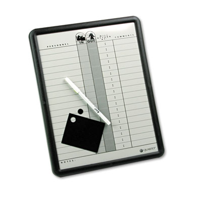 Keep your office organized and on track with this multifunctional board. Track in/out status, time of return or jot notes for up to 18 employees. Gray magnetic Duramax® porcelain surface will not scratch, dent, stain or ghost. Plastic, lightweight frame. Includes a Quartet® water-soluble marker and black magnetic in/out circles. Board Type: Employee In/Out; Board Width: 11"; Board Height: 14".