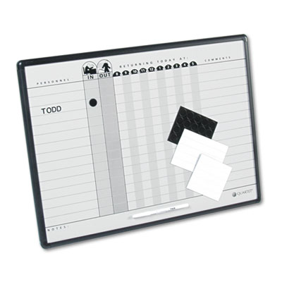 Easily track the status of employees' whereabouts. Gray magnetic Duramax® porcelain surface is easy to clean and update and will not scratch, dent, stain or ghost. Aluminum frame adds style and durability. Package includes Quartet® water-soluble marker, black magnetic in/out circles, magnetic name strips, self-stick vinyl letters, wet-erase magnetic remark strips and mounting hardware. Board Type: Employee In/Out;Magnetic; Board Width: 24"; Board Height: 18".