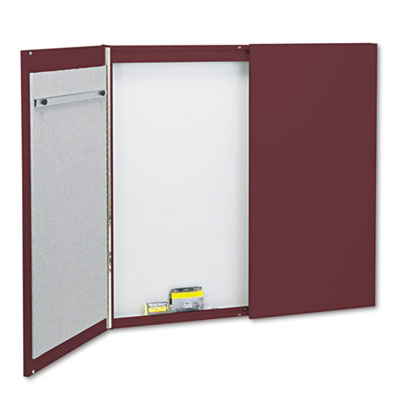 Ideal for conference rooms and training centers, the sleek cabinet design complements the sophistication of high-profile meeting rooms while its many features promote maximum productivity. The versatile cabinet includes a magnetic DuraMax® Porcelain Total Erase® surface that will not stain, ghost, scratch or dent, plus fabric-covered bulletin panels on the inside or each door. Cabinet doors feature radius edges, full-length hinges, flipchart pad holders and magnetic closures. Overall open-door width: 96". Comes complete with an easy-to-use mounting system, four Quartet® dry-erase markers, an eraser and magnets. Scratch- and stain-resistant. Measures 4" deep. Projection screen not included. Board Type: Bulletin Board; Board Width: 48"; Board Height: 48".
