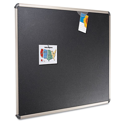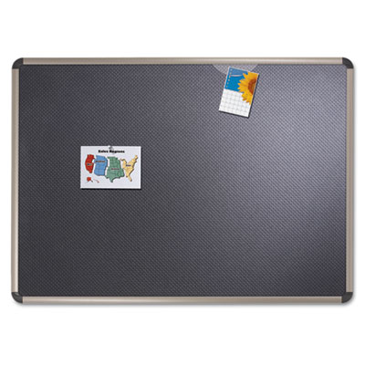 The sleek styling and upscale design of this board complements the range of contemporary environments. The resilient, self-healing foam will not crumble or fade like traditional cork boards, and maintains its hole-free surface even after years of use. The high-density fiberboard backing maximizes pin-holding power. An aluminum frame with titanium finish surrounds four sides of the high-density, embossed black foam surface for exceptional style and durability. Includes Quick Clips to hold important documents and photos without pinning. "Easy Mount" hanging system included. Board Type: Tack; Board Width: 48"; Board Height: 36".