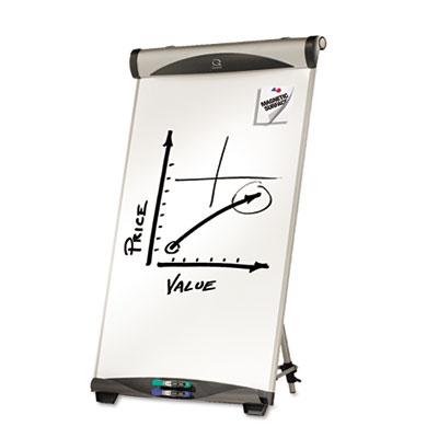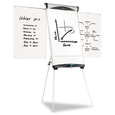 Versatile dry erase easel also includes flip chart retainer with adjustable hooks to hold any standard size flip chart pad and pad clamp for easy sheet tearaway. Magnetic surface means you can post memos, photos and more. Includes four Quartet® Enduraglide™ dry erase markers. Combination of dry erase surface and flip chart easel ideal for presentations. Extendable arms simultaneously display three flip chart sheets. Doubles as a magnetic bulletin board. Accessory tray with two built-in marker clips. Three telescoping crossed-brace legs adjust for full height or table-top. Board Type: Easel; Board Width: 27"; Board Height: 39".