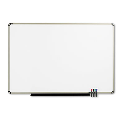 Complement your workspace with modern Euro™ styling while improving communication with this high-performance porcelain dry-erase board. Ideal for high-profile conference rooms, executive offices and other heavy-use environments, this top-quality board ensures exceptional performance with top-of-the-line DuraMax® Porcelain that will not scratch or dent. The Total Erase® surface will not stain or ghost, ensuring clear and effective communication for years to come. For added versatility, the steel-backed porcelain creates a magnetic surface, doubling its uses as a bulletin board. Also makes a great projection screen. An aluminum frame with titanium finish surrounds all sides of the Total Erase® surface for sleek styling and maximum durability. An easy-to-use corner cap mounting system holds the board tightly to the wall in four places. The board comes complete with attached marker tray, Quick Clips for easily posting documents and four Quartet® dry-erase markers. Board Type: Dry Erase;Magnetic; Board Width: 72"; Board Height: 48".