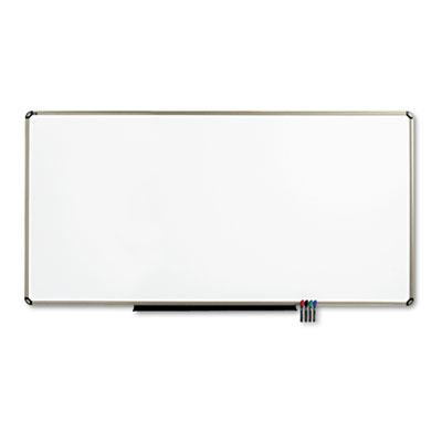 Complement your workspace with modern Euro™ styling while improving communication with this high-performance porcelain dry-erase board. Ideal for high-profile conference rooms, executive offices and other heavy-use environments, this top-quality board ensures exceptional performance with top-of-the-line DuraMax® Porcelain that will not scratch or dent. The Total Erase® surface will not stain or ghost, ensuring clear and effective communication for years to come. For added versatility, the steel-backed porcelain creates a magnetic surface, doubling its uses as a bulletin board. Also makes a great projection screen. An aluminum frame with titanium finish surrounds all sides of the Total Erase® surface for sleek styling and maximum durability. An easy-to-use corner cap mounting system holds the board tightly to the wall in four places. The board comes complete with attached marker tray, Quick Clips for easily posting documents and four Quartet® dry-erase markers. Board Type: Dry Erase;Magnetic; Board Width: 96"; Board Height: 48".
