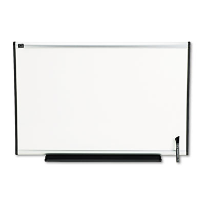 Create a polished presentation every time. An aluminum frame surrounds all sides of the high-performance Total Erase® surface for exceptional style and durability. Scratch-resistant Total Erase® surface keeps up with even the fastest-paced environment and will not stain or ghost. A subtle grid helps keep handwriting straight during brainstorming sessions and presentations. Attached marker tray conveniently stores markers and accessories. "Easy Mount" system secures board to wall. Includes Quick Clips for posting documents and a Quartet® dry-erase marker. Delivers high performance, incredible durability and elegant styling. Features contemporary radius-edged frame. Board Type: Dry Erase; Board Width: 36"; Board Height: 24".