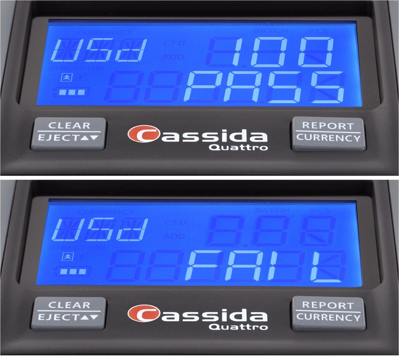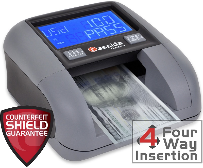 Cassida Quattro employs the most advanced technology in counterfeit detection today and eliminates the frustration of feeding bills correctly. The Quattro allows you to insert bills in any orientation – face up or face down – and instantly know whether a bill is genuine or suspect. Easy to understand PASS and FAIL indicators show if bills are legitimate or should be rejected.