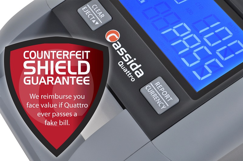 Have confidence in every transaction Quattro is backed by the exclusive Cassida Counterfeit Shield that reimburses you the full face value of the counterfeit bill within 72 hours, should your Quattro detector accept it as genuine. We’re so confident in the Quattro, because it has industry-leading detection built right in.