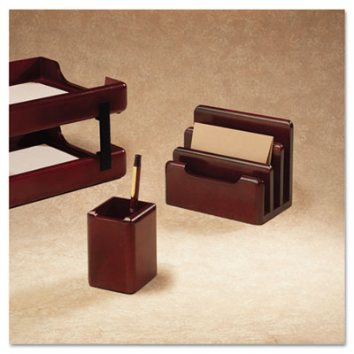 Keeps pens, pencils, scissors and rulers organized on your desktop. Nonskid pads protect desktop. Elegant durable solid wood design. Pencil Cup Type: Wood; Color(s): Mahogany; Material(s): Wood.