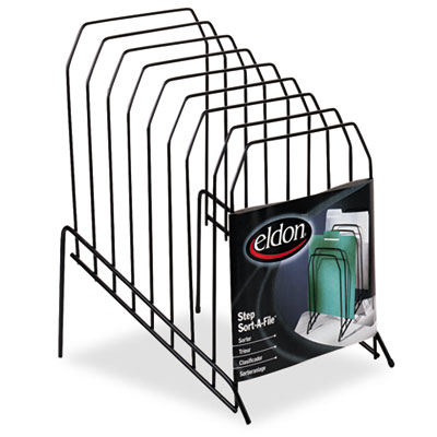 Perfect for desktop file organization, the eight graduated steps provide visible access to files so you can organize clutter in the work space. Sleek, open-wire design fits any decor and provides a clear view of work. Protective plastic tip prevent desktop scratches. Desktop File Folder Sorter Type: Inclined File Sorter; Number of Compartments: 8; Material(s): Plastic;Steel Wire.