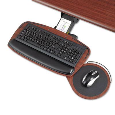 Ultra-thin, contoured keyboard platform features Comfort Zone customized positioning for superior ergonomic control. 6" height range adjustment with leverless tilt and release mechanism. Easily accessible knob adjusts tilt +10º/-15º without having to reach under the platform. Soothing gel palm rest. Meets BIFMA standards. Color: Mahogany; Workstation Type: Curved; Diagonal; Straight.