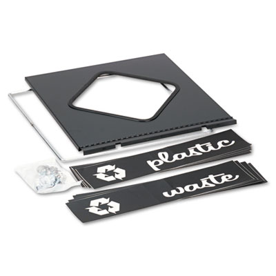 High-capacity, heavy-gauge steel containers and dedicated lids organize the collection of paper, cans, glass and waste. Hinged lid has opening for specific materials and includes appropriate self-adhesive label. (8" sq.) Waste and Plastic Label. Lid Type: Hinged; Material(s): Steel; Color(s): Black.