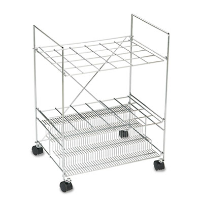 Heavy-gauge chrome-plated wire roll file folds for compact storage. Graduated steel bottom keeps all file visible and accessible. Moves easily on four swivel casters. Color: Chrome; Compartment Quantity: 24; Compartment Size: 3 1/8 x 3 1/2.
