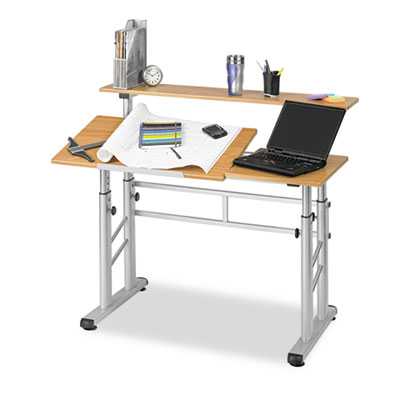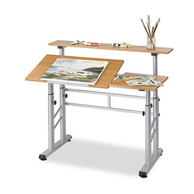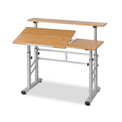 Tri-level adjustment lets you make the most of your workspace. Three-in-one design functions as a split level drafting table, workstation, shelving area, computer desk and more. Adjustable height tabletop is designed to keep computer close at hand while offering easy-access overhead space for supplies. Tables can be easily lowered to serve as one flat working surface or raised to perform as a standing-height workstation. Tilts up to 50°. Steel frame and woodgrain melamine top. Top Color: Medium Oak; Gray; Top Shape: Rectangular.