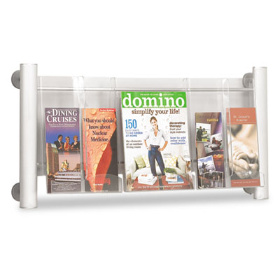 An upscale display with a sleek silver-coated, brushed aluminum frame. Clear acrylic pockets offer optimum visibility of contents. Wall-mounted and floor-standing racks have center dividers that allow for pockets to be sized for magazines or pamphlets. Color: Clear; Silver; Overall Width: 31 3/4"; Overall Depth: 5".