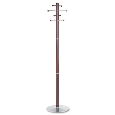 Coat tree with four double hooks holds up to eight garments. Ball tips prevent damage to garments. Wood with brushed aluminum hooks and accents. Eight oversized ball-tipped hooks won't damage garments. Mounting: Stand Alone; Width: 15"; Depth: 15".