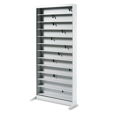 Store audio/video media in any combination on 6" deep shelves. Shelves adjust up or down in 1" increments to fit audio cassettes, CDs, VHS, DVCAM, Hi8MP and 8mm media. Bookend dividers (12 included) adjust in or out so media titles can be easily viewed while keeping media neatly in place. Heavy-gauge steel. 36w x 13-1/4d x 78h. Color: Light Gray; Overall Width: 36"; Overall Depth: 13 1/4".
