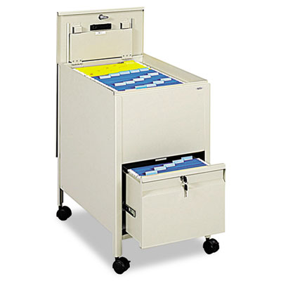 Sturdy steel construction with a textured finish. Tub file on top with slide-away cover keeps dust out while securing files. File drawer below for additional storage. Both compartments are keyed alike. Four swivel casters (two locking) for easy mobility. Four keys included. Color: Putty; Overall Width: 17"; Overall Depth: 26".