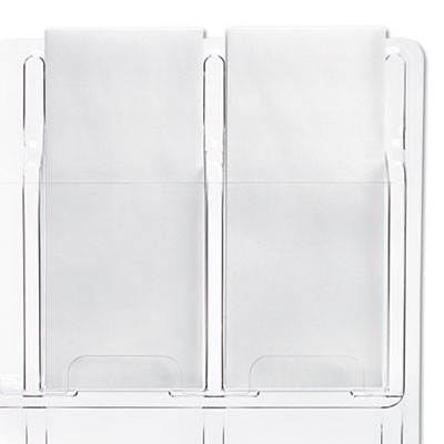 Think outside the box by looking in! Design displays literature clearly. Unobtrusive, break-resistant, clear plastic racks blends into any office environment. Each pocket holds up to 1 3/4" of material. New front panel design features easy-to-clean opening. All are single-piece units and require no assembly. Wall mounting hardware included. Color: Clear; Overall Width: 30"; Overall Depth: 2".