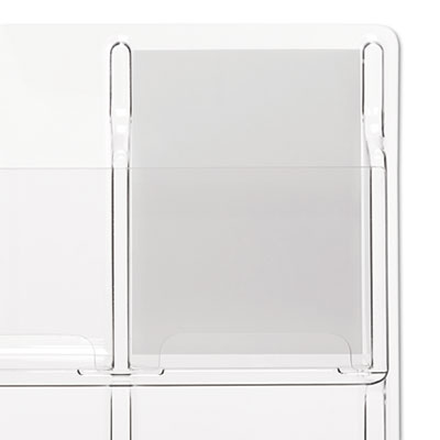 Think outside the box by looking in! Design displays literature clearly. Unobtrusive, break-resistant, clear plastic racks blends into any office environment. Each pocket holds up to 1 3/4" of material. New front panel design features easy-to-clean opening. All are single-piece units and require no assembly. Wall mounting hardware included. Color: Clear; Overall Width: 30"; Overall Depth: 2".