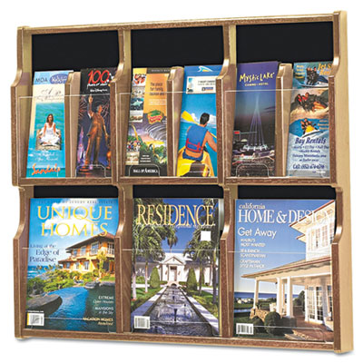 Expose your guests and employees to your literature, brochures or pamphlets in a neat and organized way. Rich wood finish brings style and flair to any room. Crystal clear plastic front panel provides a full view of materials in each pocket. Removable dividers allow you to use each compartment to display a magazine or two pamphlets. Pre-drilled holes, screws and anchors included for easy mounting. Decorative screw covers match masonite backing. Holds 6 Magazines or 12 Pamphlets. Color: Medium Oak; Overall Width: 29 3/4"; Overall Depth: 2 1/2".
