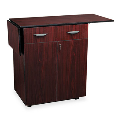 Be good to your guests, your team and yourself with the ultimate mobile Hospitality Service Cart. Drop leaf design extends serving area while the locking double door cabinet contains a height adjustable interior shelf for storage of hospitality supplies. Spacious drawer organizes silverware, napkins, and smaller items. Color: Mahogany; Capacity (Weight): 150 lbs.; Caster/Glide/Wheel: Four Swivel Casters (2 Locking).