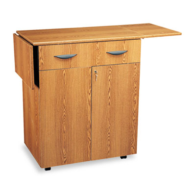 Be good to your guests, your team and yourself with the ultimate mobile Hospitality Service Cart. Drop leaf design extends serving area while the locking double door cabinet contains a height adjustable interior shelf for storage of hospitality supplies. Spacious drawer organizes silverware, napkins, and smaller items. Color: Medium Oak; Capacity (Weight): 150 lbs.; Caster/Glide/Wheel: Four Swivel Casters (2 Locking).