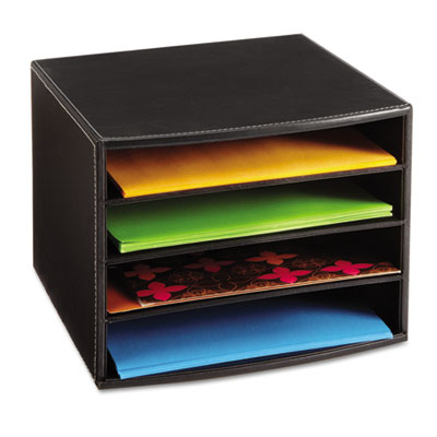 Four-section desktop literature sorter keeps you organized. Stylish leather look with stitching accents. Literature Sorter Type: Open Front; Number of Compartments: 4.