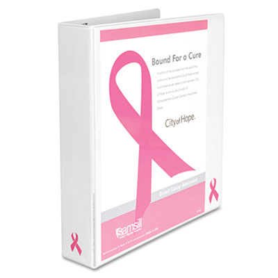 Bound for a Cure! Supporting cancer research with a binder marked with hope. A pink ribbon is screen printed on the front and spine of the overlay $.10 for each binder sold benefits breast cancer research, education, and treatment with The Breast Cancer Research Foundation. A pink ribbon is screen printed on the front and spine of the overlay. Clear overlay on front, back and spine for easy customization. Ring located on back lid to reduce wear on paper. Capacity Range [Max]: 1 1/2"; Sheet Capacity: 350; Color(s): White.