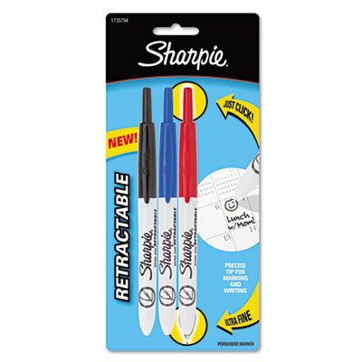 Retractable marker for easy one-handed operation--just click and write. Safety Seal™ valve prevents leakage and dry out, and there is no cap to remove or lose. Durable ultra fine point tip produces precise marking and writes on most hard-to-mark surfaces. Quick-drying ink is waterproof, smearproof and fade-resistant. Marker Type: Permanent; Assortment: Black;Blue;Red; Color(s): Assorted.